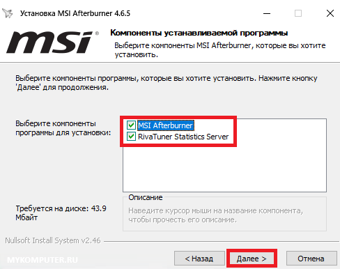 Шаг 1 устанавливаем MSI Afterburner, скачать можно с официального сайта по ссылке>>>. Во время установки обязательно отметьте галкой оба параметра MSI Afterburner и RivaTuner Statistics Server.
