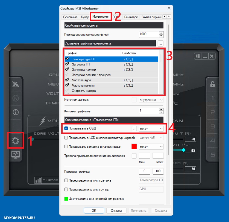 Шаг 2 настраиваем MSI Afterburner, запускаем программу и переходим в Настройки (шестеренка), открываем вкладку Мониторинг. Здесь отмечаем (ставим галку) те параметры, которые хотим видеть и затем для каждого параметра выбираем (ставим галку) Показывать в ОЭД.