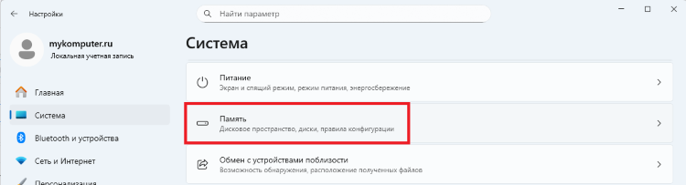 Шаг 1 заходим в Параметры, далее выбираем Система, выбираем и заходим в Память.