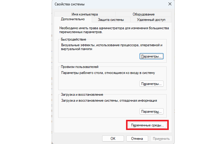 Нажимаем клавиши Win+R на клавиатуре и вводим sysdm.cpl в окно Выполнить и нажмите Enter. Переходим на вкладку Дополнительно и нажмите кнопку Переменные среды.