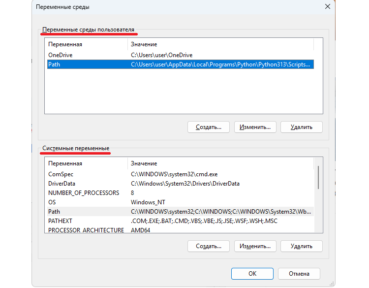 В разделе Переменные среды пользователя находим переменную Path и выберите Изменить. Для изменений, касающихся всех пользователей, выберите Path в Системные переменные.